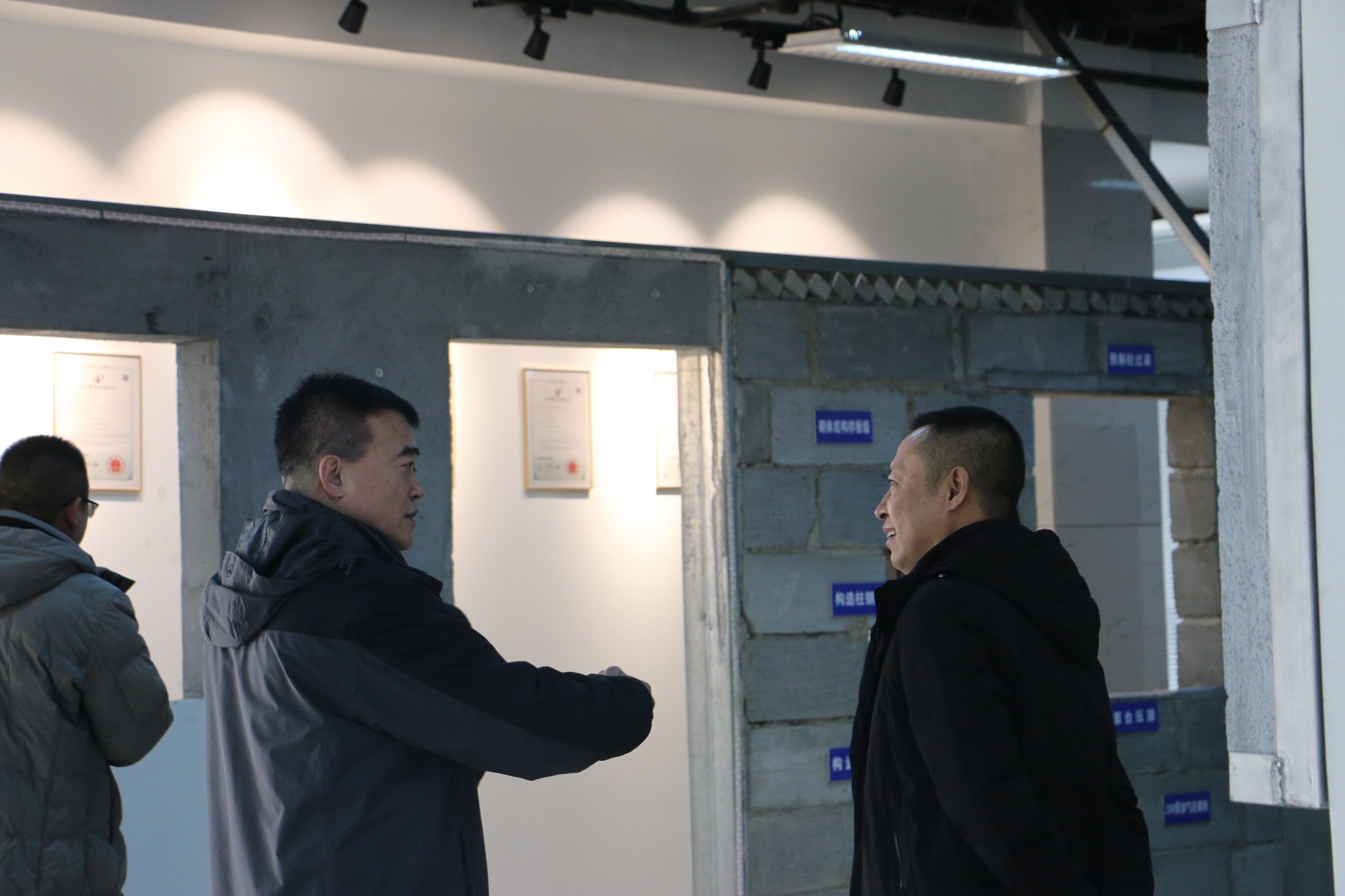 王總一行在我司史總的陪同下,參觀了公司一樓展廳,史總對公司的行業發展歷程、施工技術、產品性能、低碳環保等做出了詳細的介紹。在參觀樣板墻體時,王總對墻體的輕質高強、隔音保溫等性能給予高度評價。他表示,我們的施工工藝很先進,解決了傳統工藝產品空鼓、開裂等問題,相比于傳統工藝,降低了勞動成本,提高了勞動效率,并且符合國家的產業政策,發展前景廣闊。