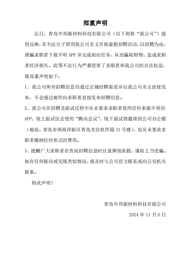 關于不法分子冒用我公司名義虛假招聘情況的鄭重聲明