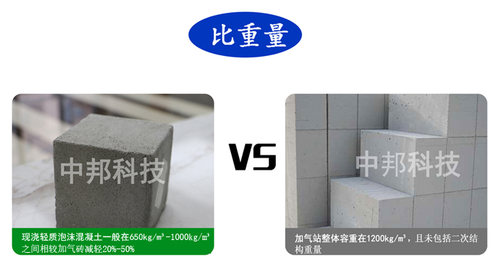 現澆輕質泡沫混凝土墻體一般為650kg/m³-1000kg/m³之間,相較加氣磚墻體同等強度容重更輕,可減輕20%-50%;